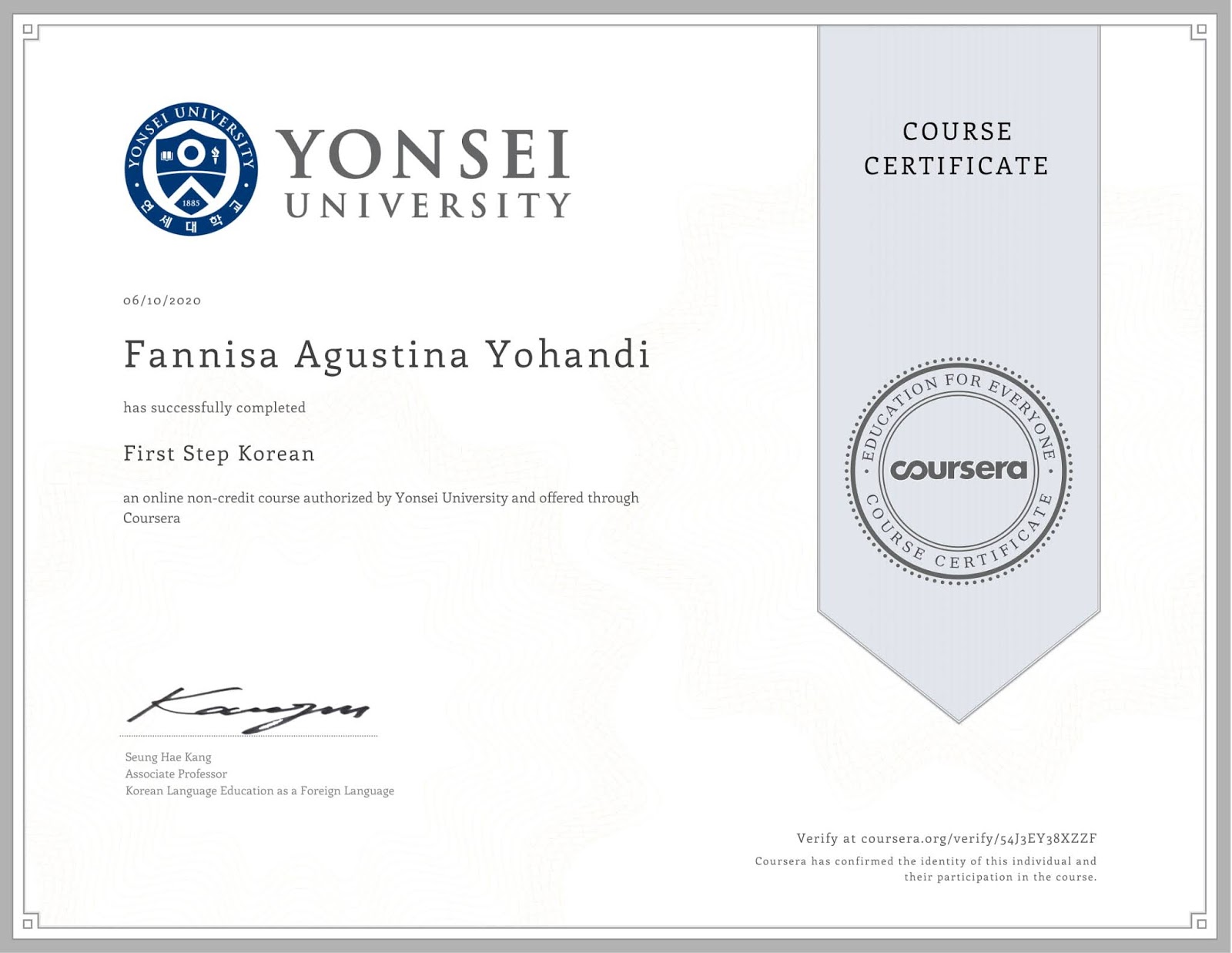 The first one is "First Step Korean", which instructor was Kang Seung Hae, an Associate Professor from Yonsei University. This course improved my Korean, particularly in the speaking comprehension. I also learned some grammar, pronounciation, some new vocabularies, and famous culture of Korea. This course has helped me to understand spoken and written Korean more than I did before.